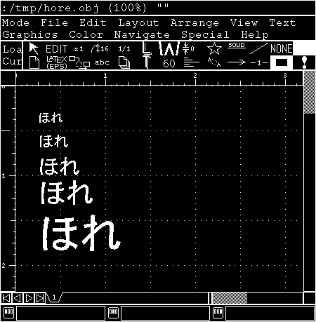 久々にtgif使った。そういや、まだX-ttで増えたフォントを使えるように してなかった。いままでだと日本語フォントは14,16,24くらいしか出なくって いまいち嬉しくなかった。~/.Xdefaults にこんなん足した。